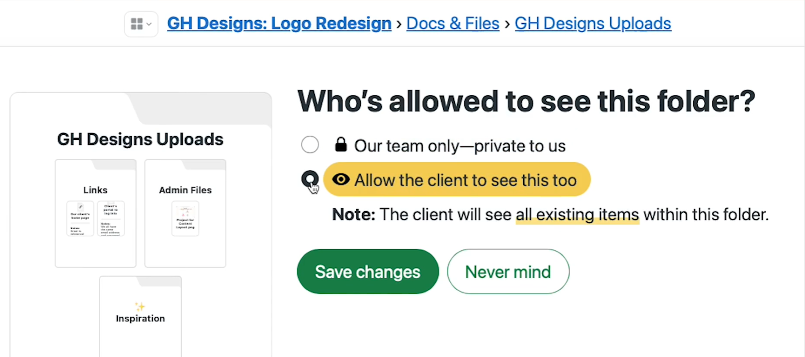 You have the option to choose whether the client can see a particular document or not, which is great, but it can be a hassle when you have to do it for every folder you open.