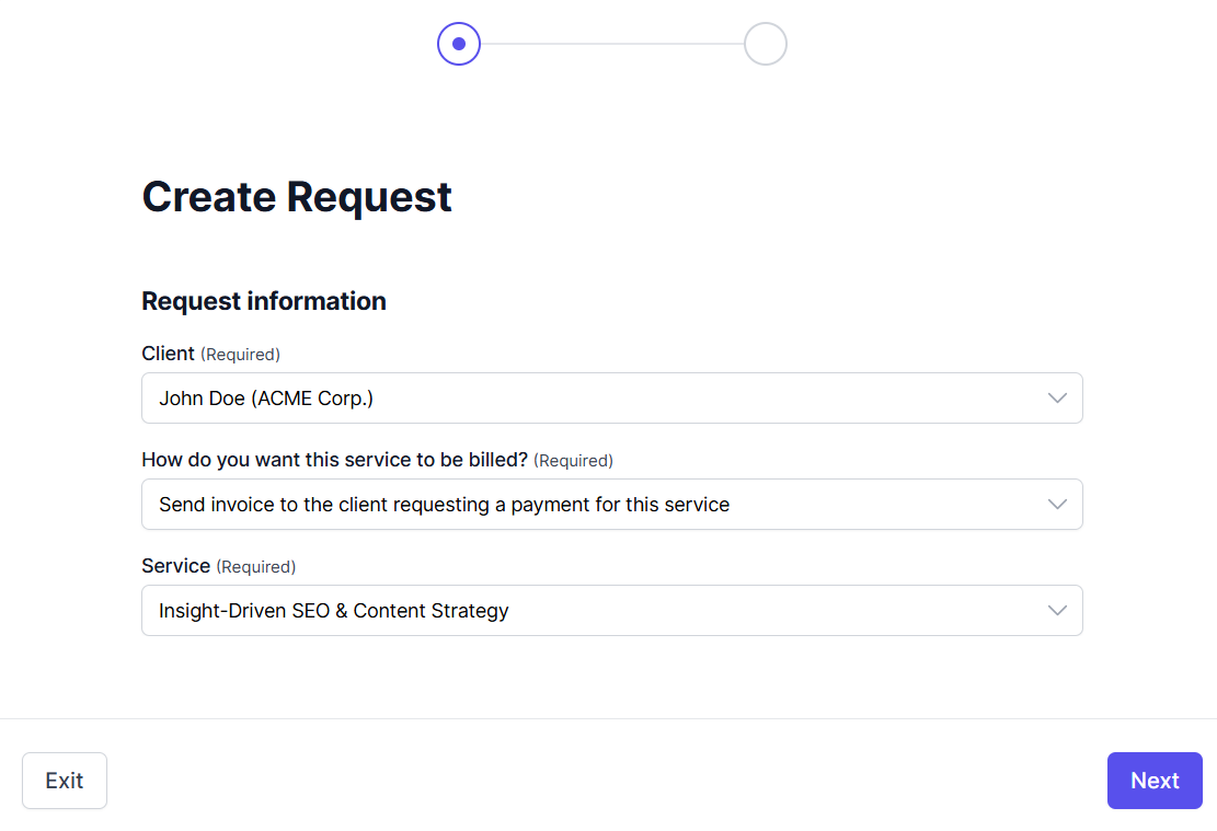 You can also create requests from your end if a client reaches out via email or Slack. Just fill out the form, and the client sees it in their portal immediately.
