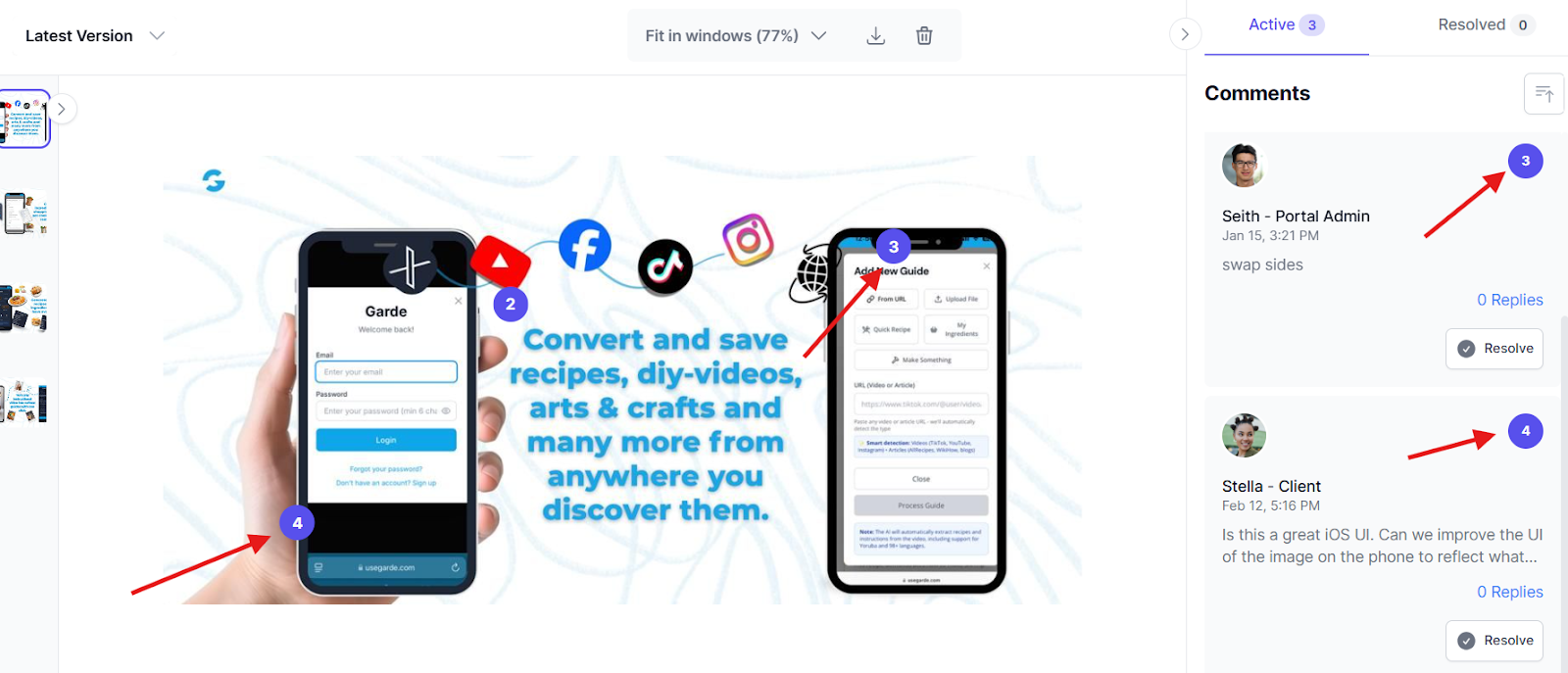 When your team uploads a design for review, the client can annotate the image by clicking on specific areas and adding comments. Each annotation gets a numbered marker, and all feedback is threaded to that exact spot on the file.