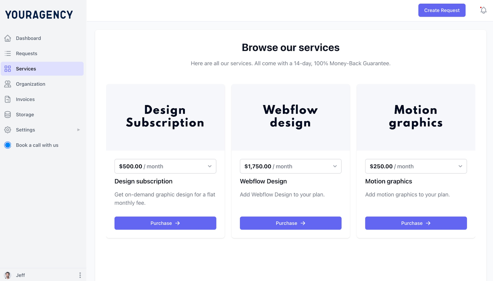 If you run a productized service or subscription model, you can create a service catalog where clients browse your offerings, see pricing, and purchase directly from their portal.