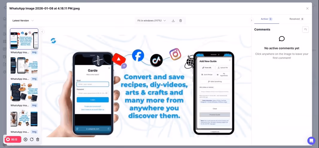 The design proofing feature helps reviewers click directly on images, PDFs, or videos and write comments on the exact spot that needs attention. Video proofing is timestamped; pause at a specific frame and leave feedback tied to that moment.
