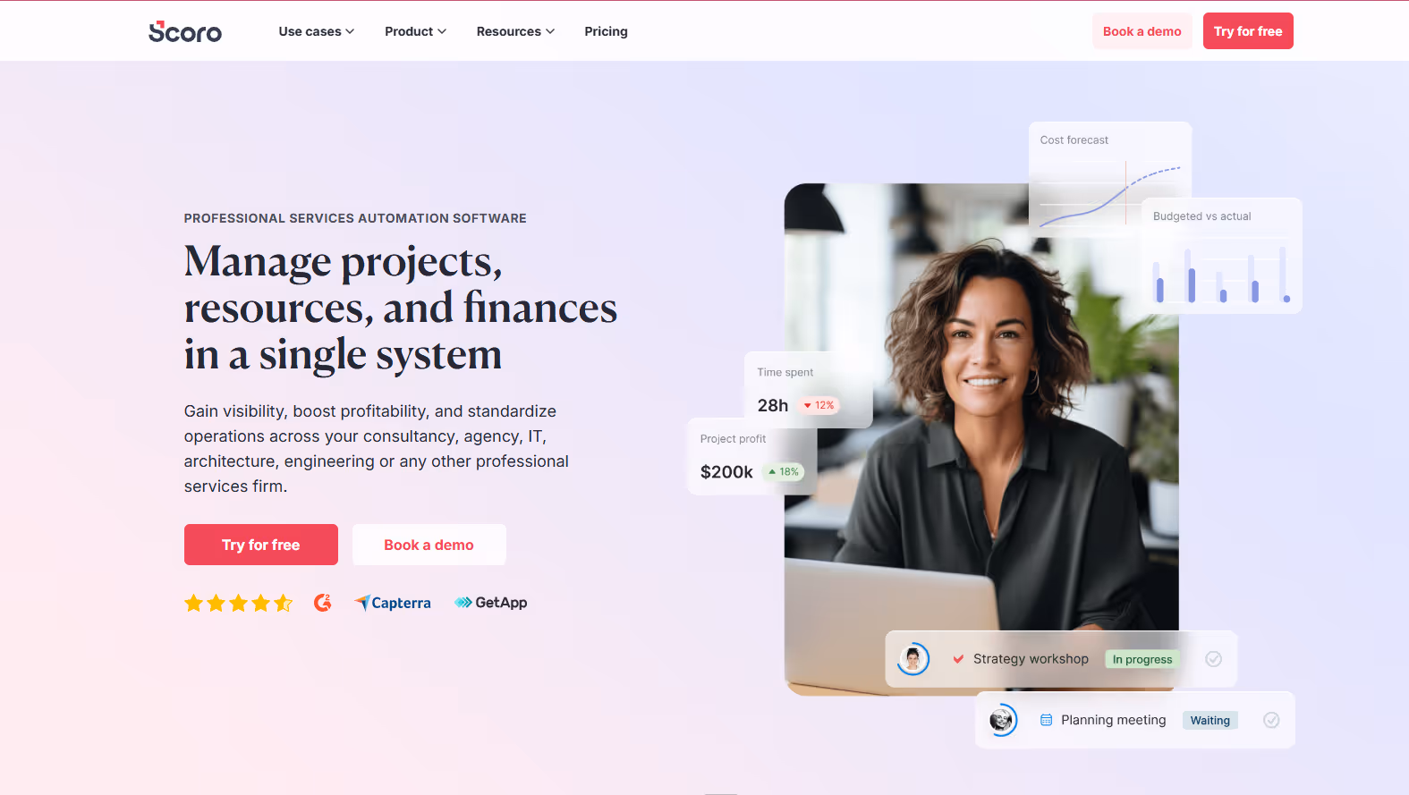 Scoro calls itself a professional services automation (PSA) tool for "consultancies and agencies." The core promise is that it’s a system to connect what you deliver to how your business performs.