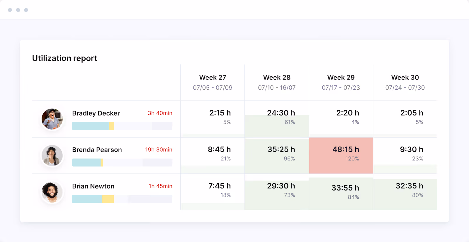 Resource planning with utilization heatmaps that show who has a balanced workload and who's at risk of overload.