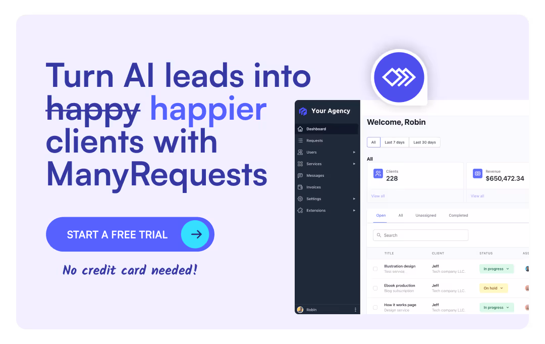 ManyRequests gives you a custom portal where you can have many services listed, automate invoices, and manage your tasks in one place. Clients can also chat with you (and you can exchange messages with your team members). Everything is kept in one easy-to-find place, which makes it user-friendly for agencies of all sizes. Sign up for a 14-day free trial to see how it works.