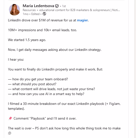 I first heard about magier when Maria Ledentsova’s, their marketing manager, made a post about their LinkedIn playbook that got them over $1M in revenue. They also got 10k+ email leads— which is a lot.