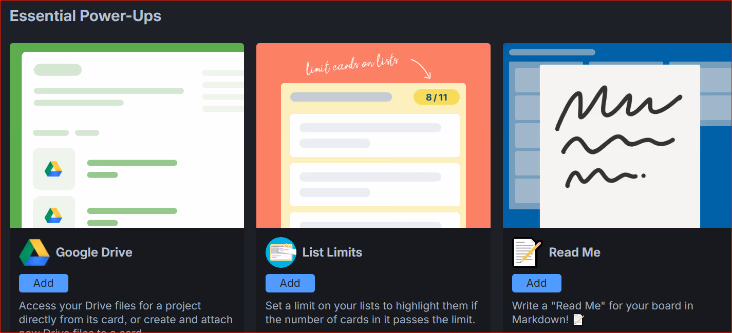 You can boost Trello’s capabilities, adding extras using Power-Ups. This integrates Trello with other tools.