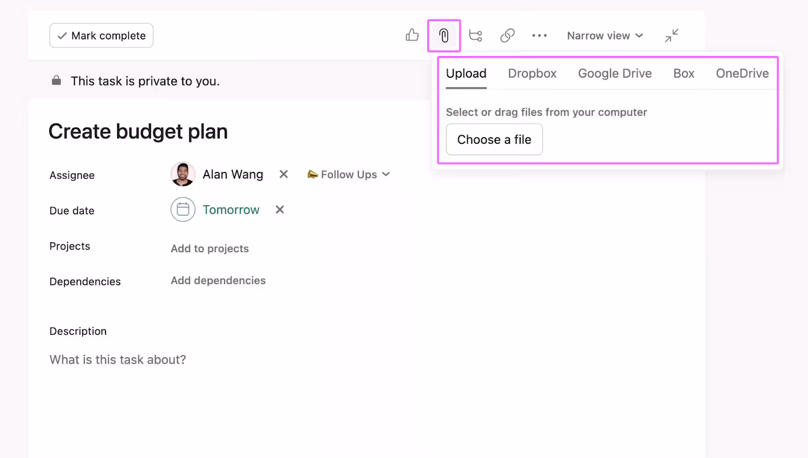 Asana is all about tasks. You split work into steps, assign owners and set deadlines. Each task holds comments, and files.