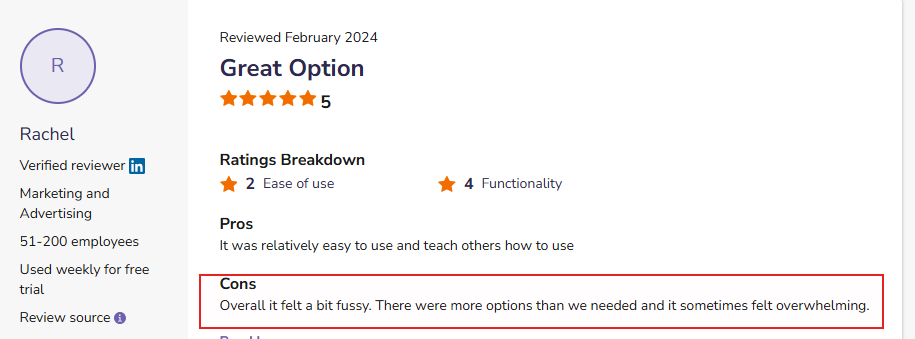 There are many other users who wrote this after commending the efficacy of its solutions. For example, this user complains about its rigid UI and UX, and how it’s frustrating to manually track time and add people to tasks/projects:
