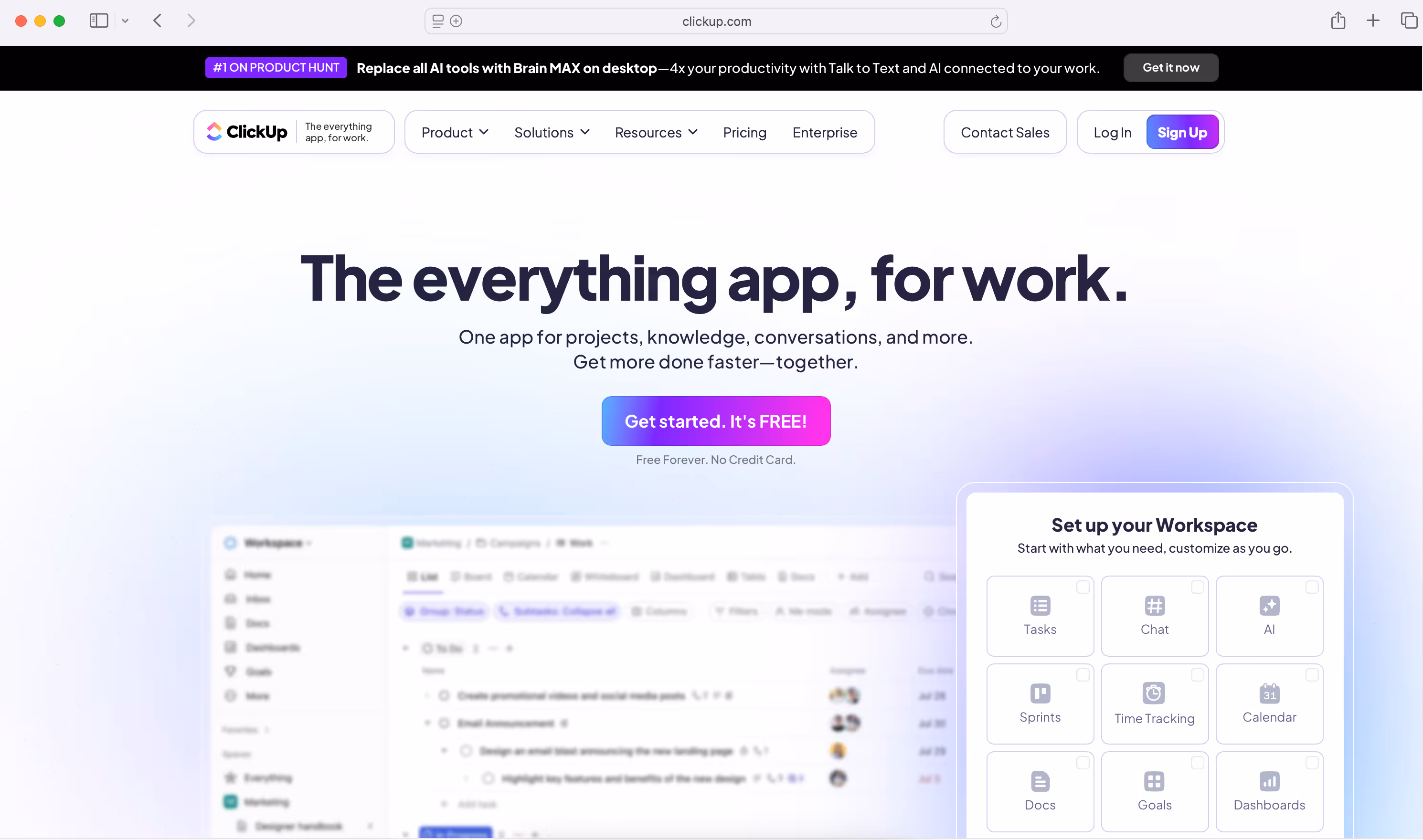 ClickUp is a workload management tool that gives you a visual snapshot of who’s loaded and who’s still got room in your creative team. No more guessing who to assign that urgent client task to. You can zoom in/out to see workload by day, week, or month—best for planning or making quick adjustments in the middle of a task.