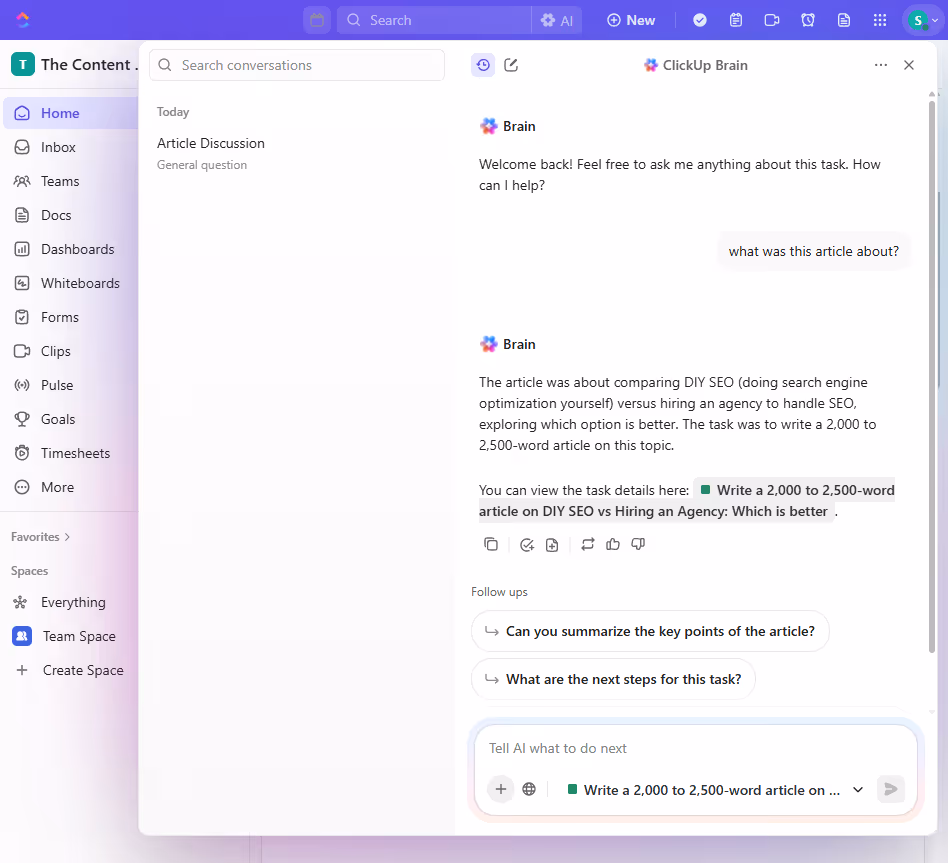 It also has ClickUp Brain, which you can use to ask any questions in your entire platform. For example, I highlighted an article I added to ClickUp and asked the AI what it was about. The AI read the brief ad task conversation and answered: