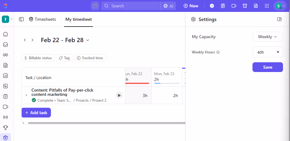 You can track time directly in the relevant tasks, manually enter time entries, or use the browser extension to track automatically. You can even set a specific weekly capacity so you don’t overwork yourself: