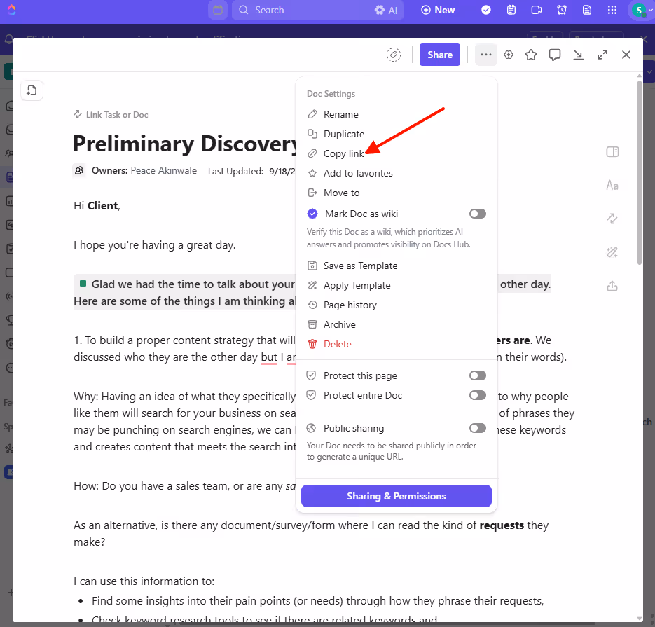 It lives alongside your tasks, and you can create SOPs, client documentation, meeting notes/summaries, and any type of knowledge bases in Docs, then link them to related tasks. For example, I created this doc, and I can easily copy the link and attach it to any task, other docs, and even knowledge bases.