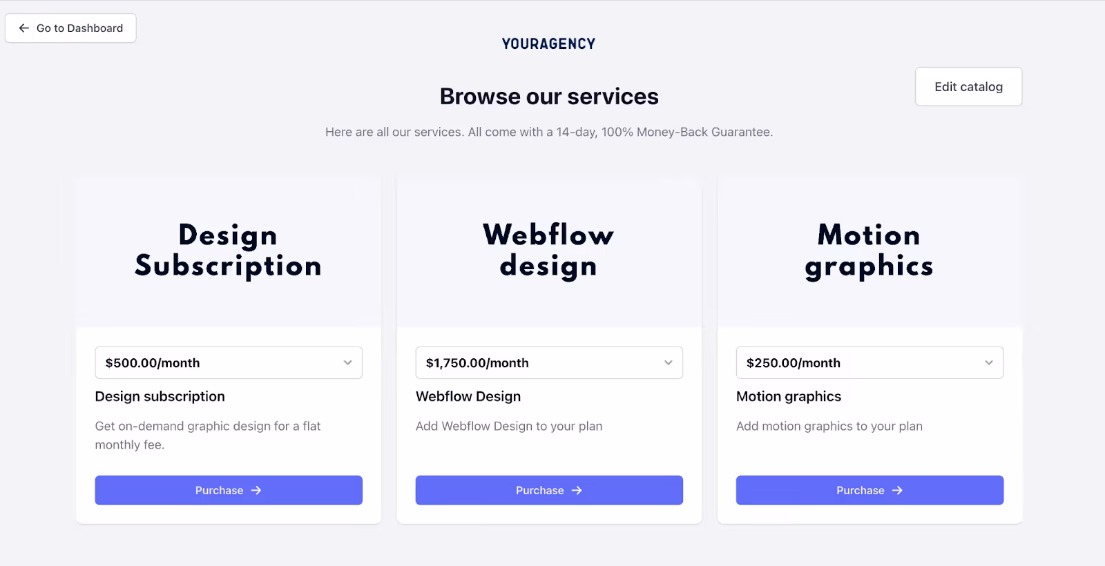 2. Onboarding feature: When they hit “Get Started”, they’re prompted to pay (which validates their contract with you). If you charge clients after the service, you can deactivate the purchase button. You can even allow them to start with a free trial. Here’s what your onboarding flow can look like: