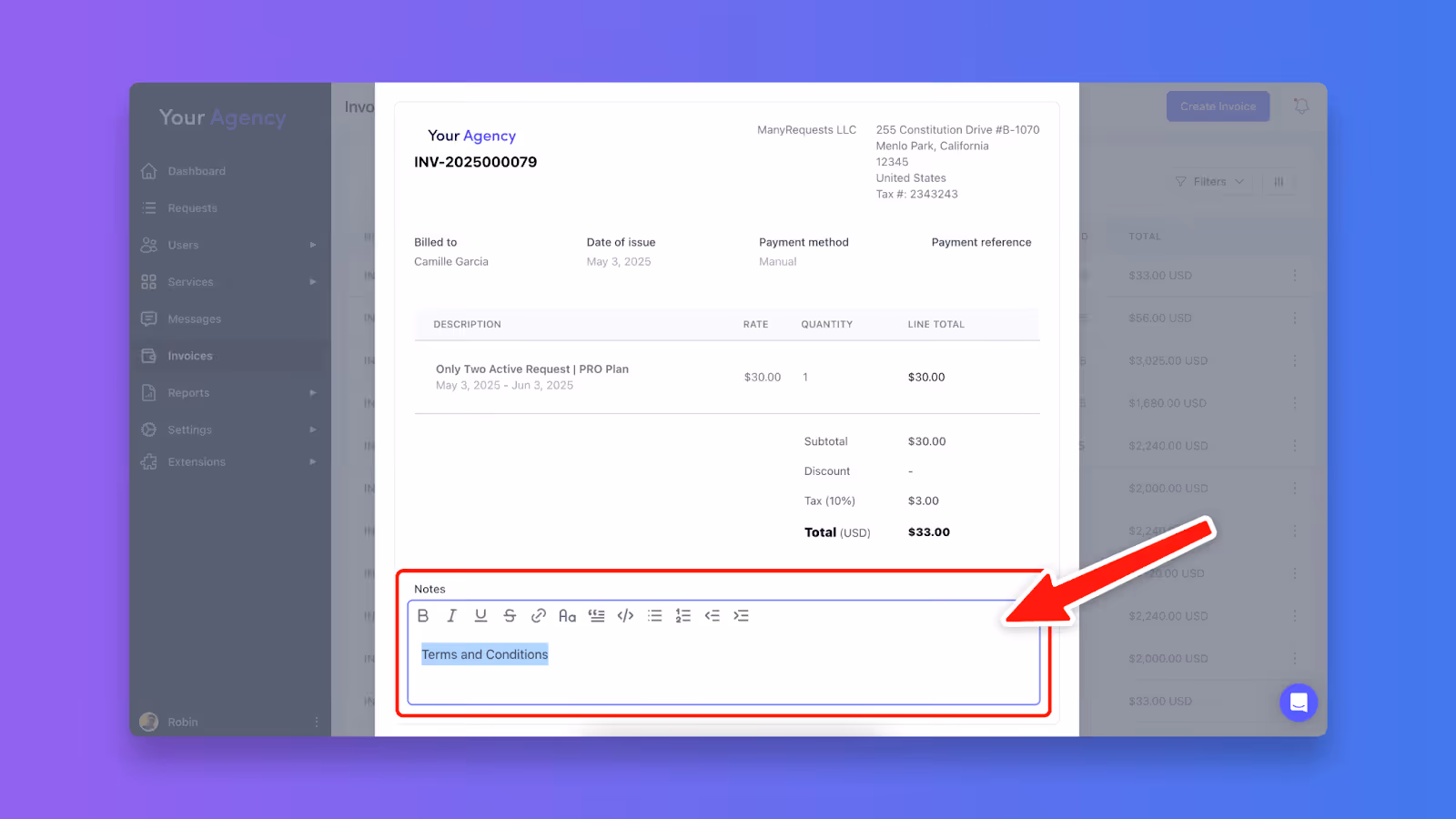 4. ManyRequests automatically creates invoices for completed tasks, so you don’t get bogged down by the administrative work of writing invoices and mailing them. Clients also get automated follow-up messages if the invoice is unpaid on your due date.