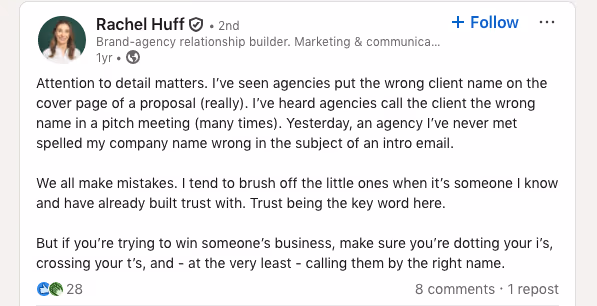 It sounds obvious, but Rachel Huff, a brand-agency relationship builder, put it plainly. She has seen agencies put the wrong client name on a proposal cover, call the client the wrong name in a pitch meeting, and misspell the company name in an intro email.