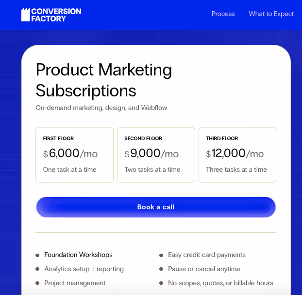 Conversion Factory structures its as First Floor at $6k per month, Second Floor at $9k per month, and Third Floor at $12k per month. Each tier has clear deliverables and no surprise charges.